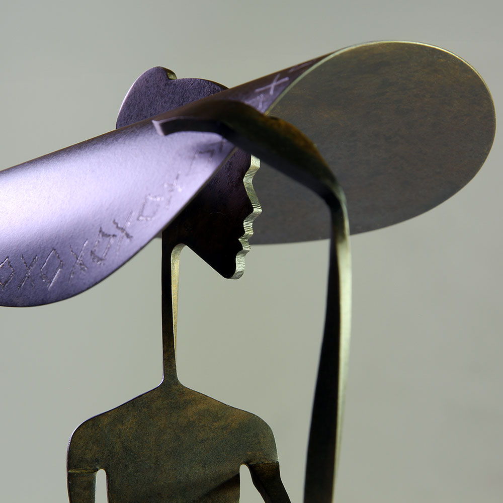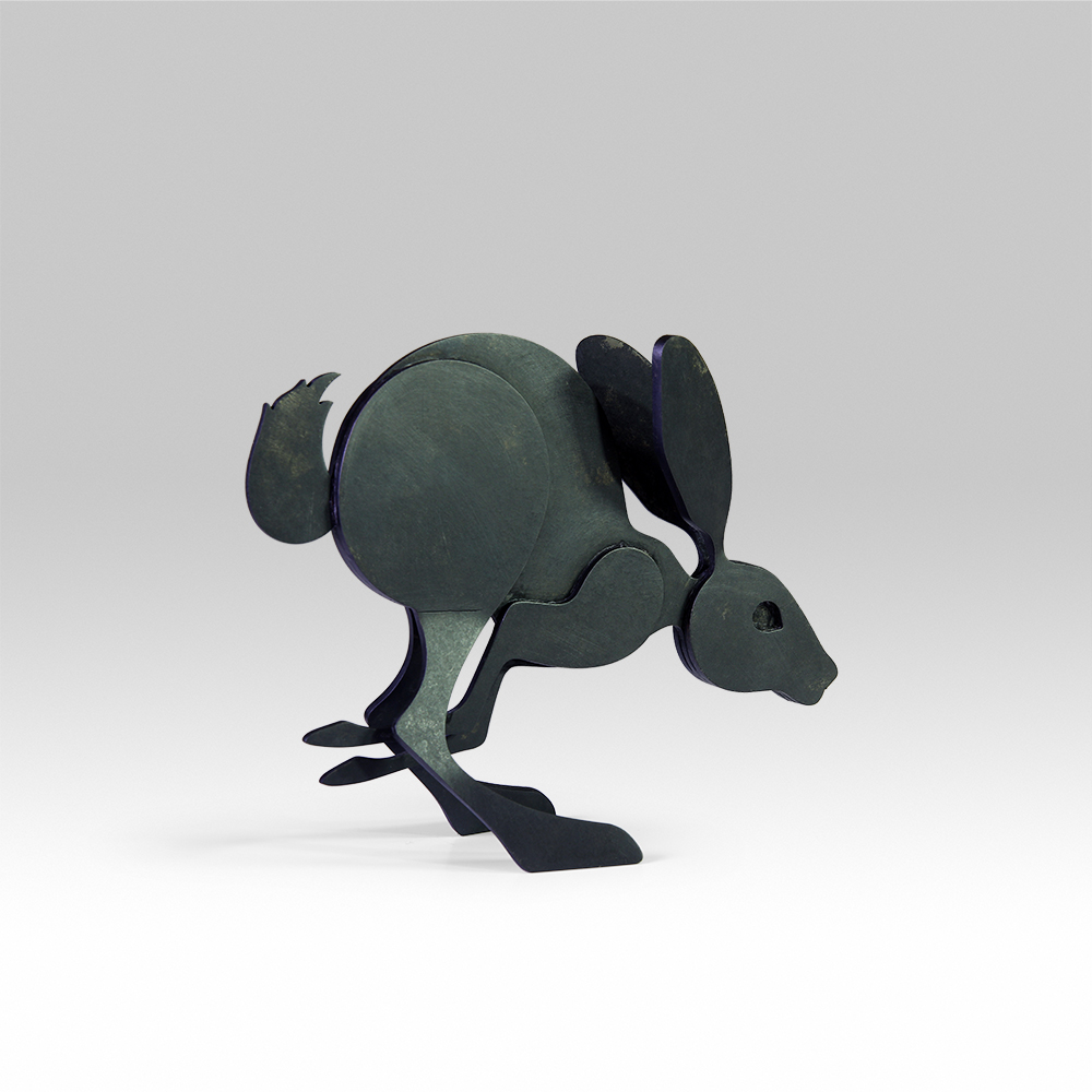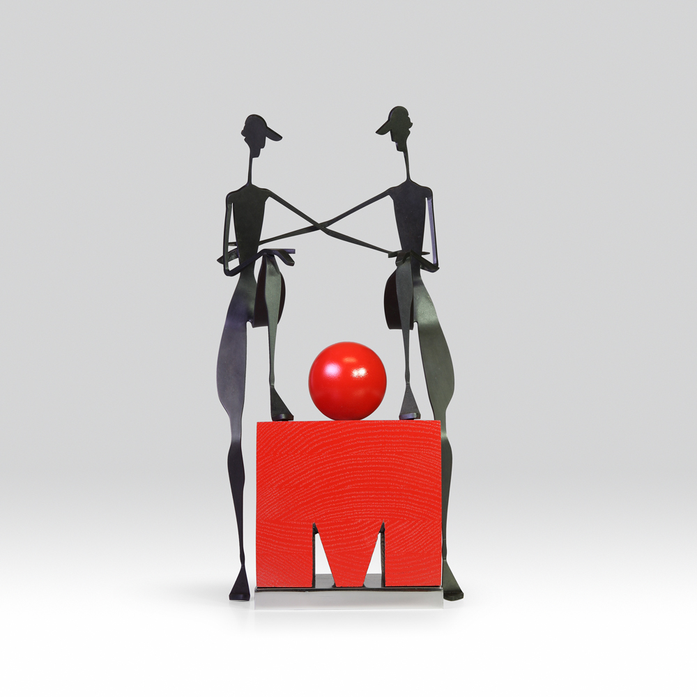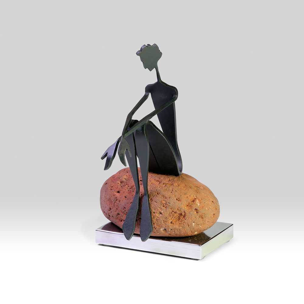 Travaillant principalement le métal, parfois associé à la pierre ou au bois, Duchesne privilégie des lignes fines et des silhouettes élancées qui suggèrent le mouvement, la fragilité et l’équilibre. Chaque pièce devient un fragment de récit où posture, tension et silence invitent le regardeur à compléter l’histoire.