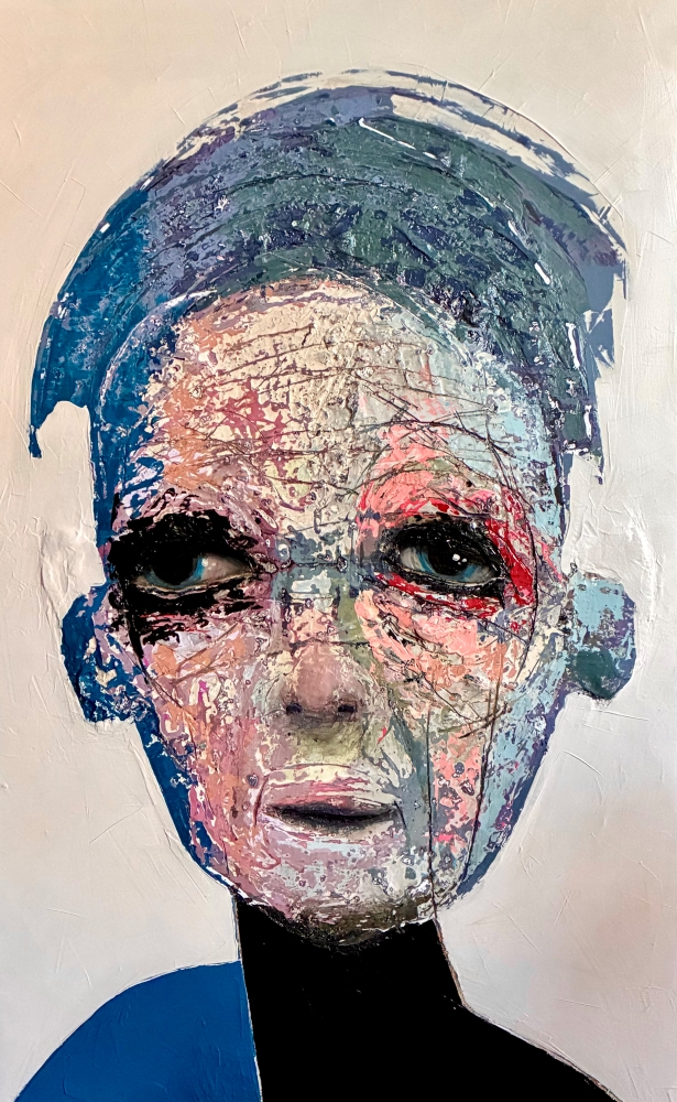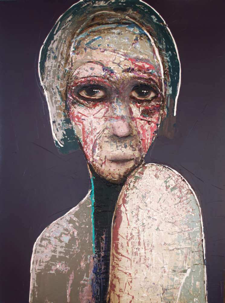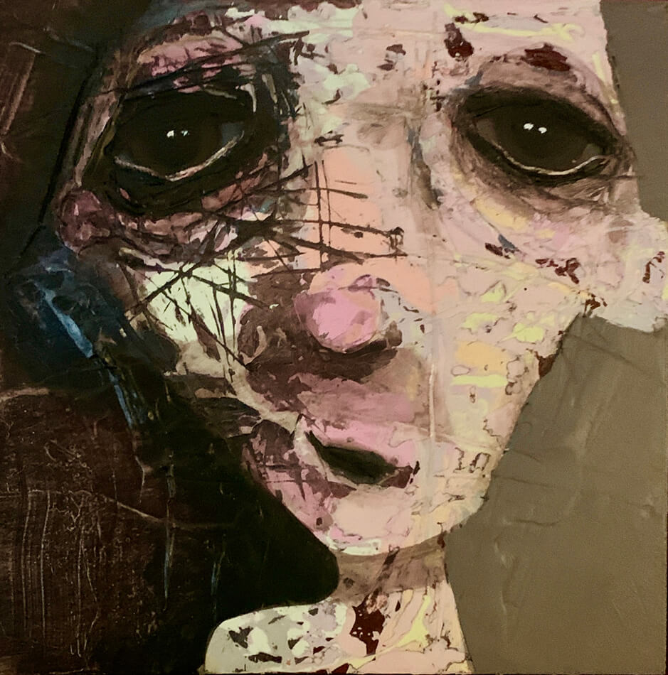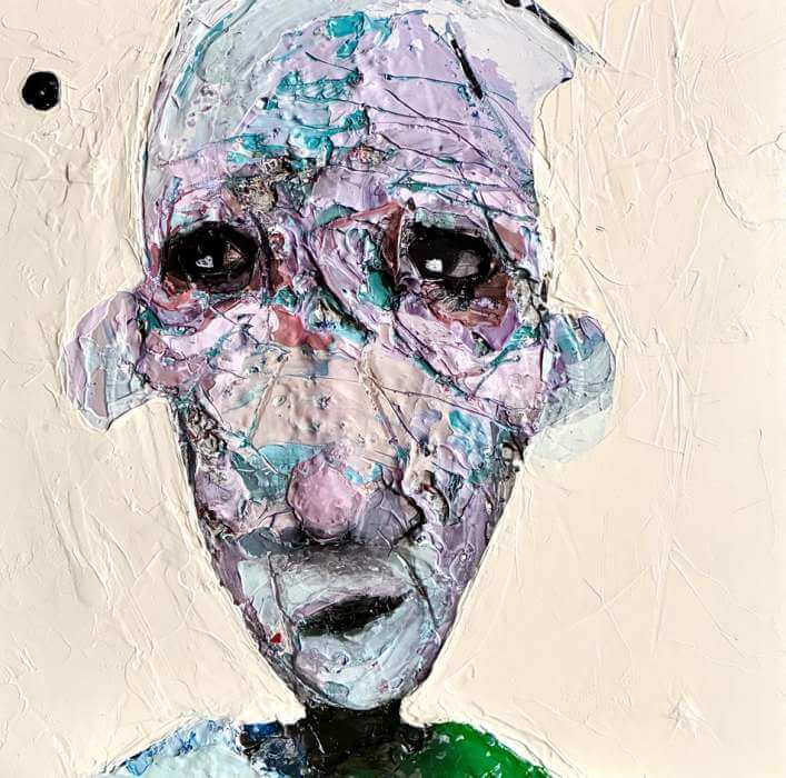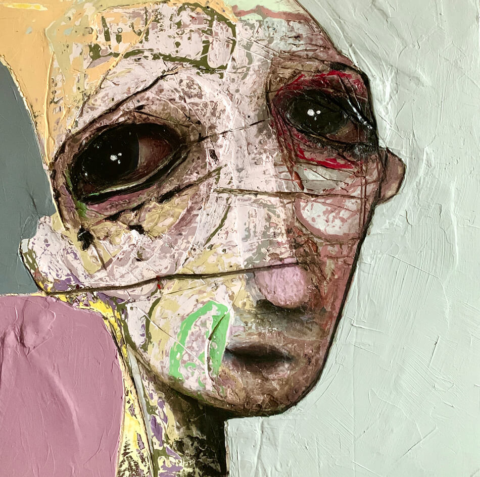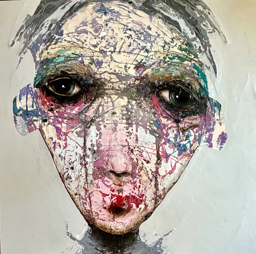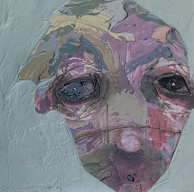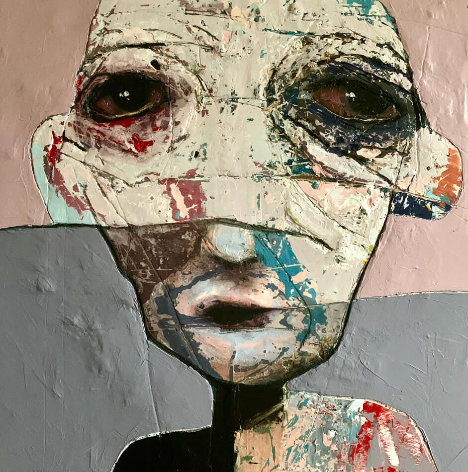 Born in Montreal in 1971, Sylvain Coulombe is an accomplished artist. Singer, composer, sculptor, architect (he graduated in Environment Design from UQÀM), he experienced art through numerous facets. Painting is now one to which he dedicates himself almost exclusively. His approach is a self-taught one and it is through his research and experimentations that he found his own plastic language. He loves paradoxes. As a matter of fact, his portraits can represent austere characters with complex expressions, geometrical compositions or round or long faces, like masks but illuminated by a rainbow of colour, often pastel. Eyes are greenish-blue, one blue, one black and gazes are divergent, one above, the other one to the right. His characters may surprise at first. From silent and cold, they rapidly convey an impression of wisdom and softness by the intensity of their gaze. ”I love what is old, what has lived. These characters carry with them signs of time’s passing, on their body, on life, and the stories that come with it. They reveal the obstacles of life, the idea of perseverance. In life, one has to work hard to appreciate something. And sometimes, it is a heavy burden to carry.” ”Each painting has a story, a meaning. The objective is not for the spectator to see it through my story but rather for him to create a personal dialogue with the artwork.”