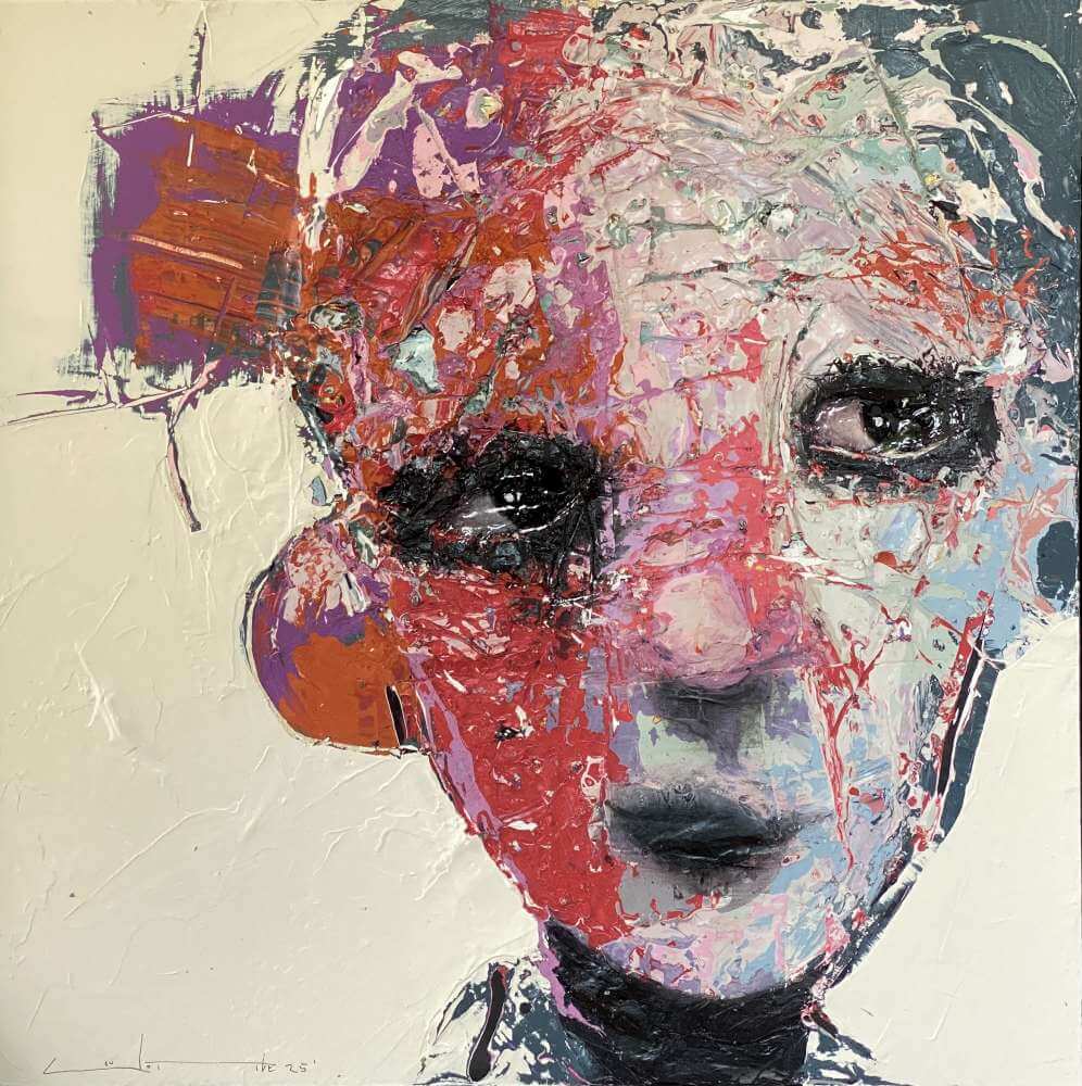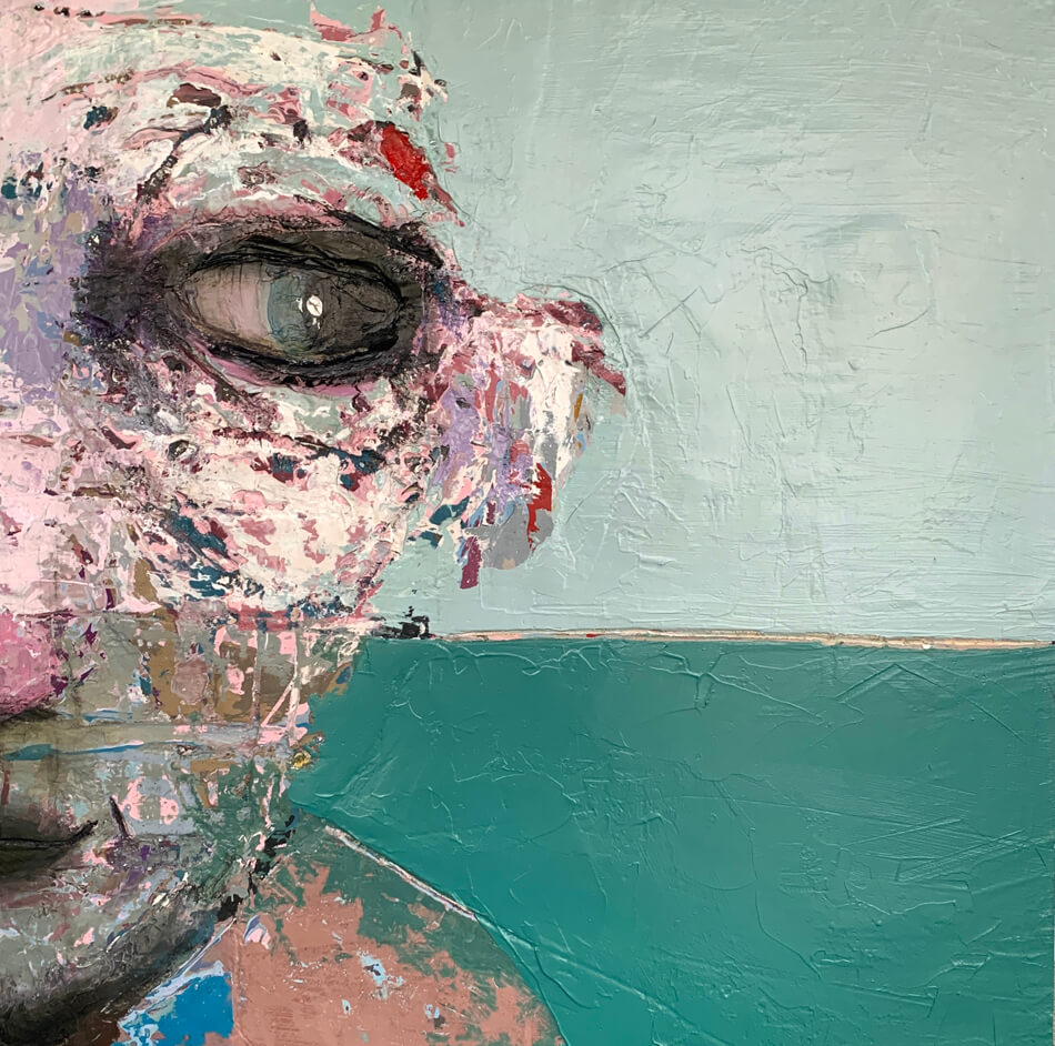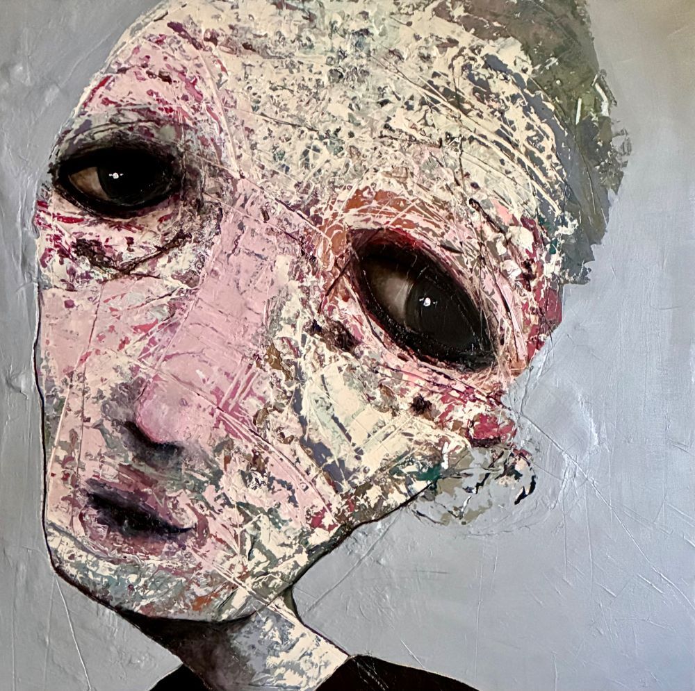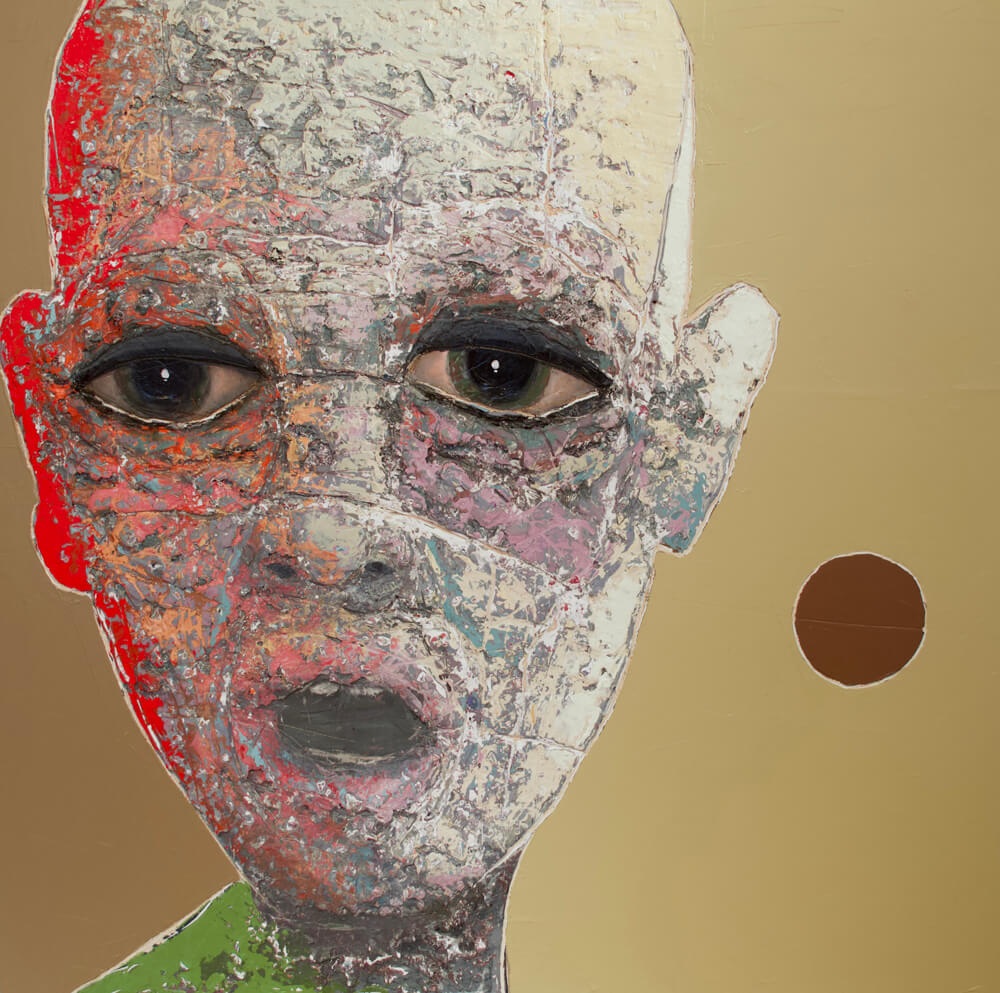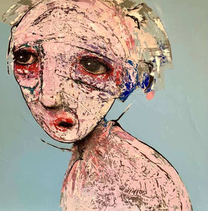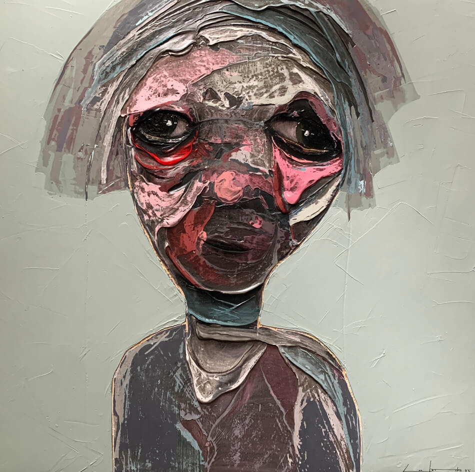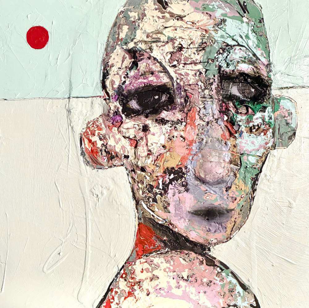 Born in Montreal in 1971, Sylvain Coulombe is an accomplished artist. Singer, composer, sculptor, architect (he graduated in Environment Design from UQÀM), he experienced art through numerous facets. Painting is now one to which he dedicates himself almost exclusively. His approach is a self-taught one and it is through his research and experimentations that he found his own plastic language. He loves paradoxes. As a matter of fact, his portraits can represent austere characters with complex expressions, geometrical compositions or round or long faces, like masks but illuminated by a rainbow of colour, often pastel. Eyes are greenish-blue, one blue, one black and gazes are divergent, one above, the other one to the right. His characters may surprise at first. From silent and cold, they rapidly convey an impression of wisdom and softness by the intensity of their gaze. ”I love what is old, what has lived. These characters carry with them signs of time’s passing, on their body, on life, and the stories that come with it. They reveal the obstacles of life, the idea of perseverance. In life, one has to work hard to appreciate something. And sometimes, it is a heavy burden to carry.” ”Each painting has a story, a meaning. The objective is not for the spectator to see it through my story but rather for him to create a personal dialogue with the artwork.”