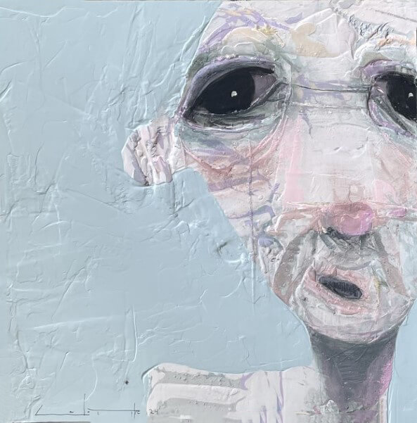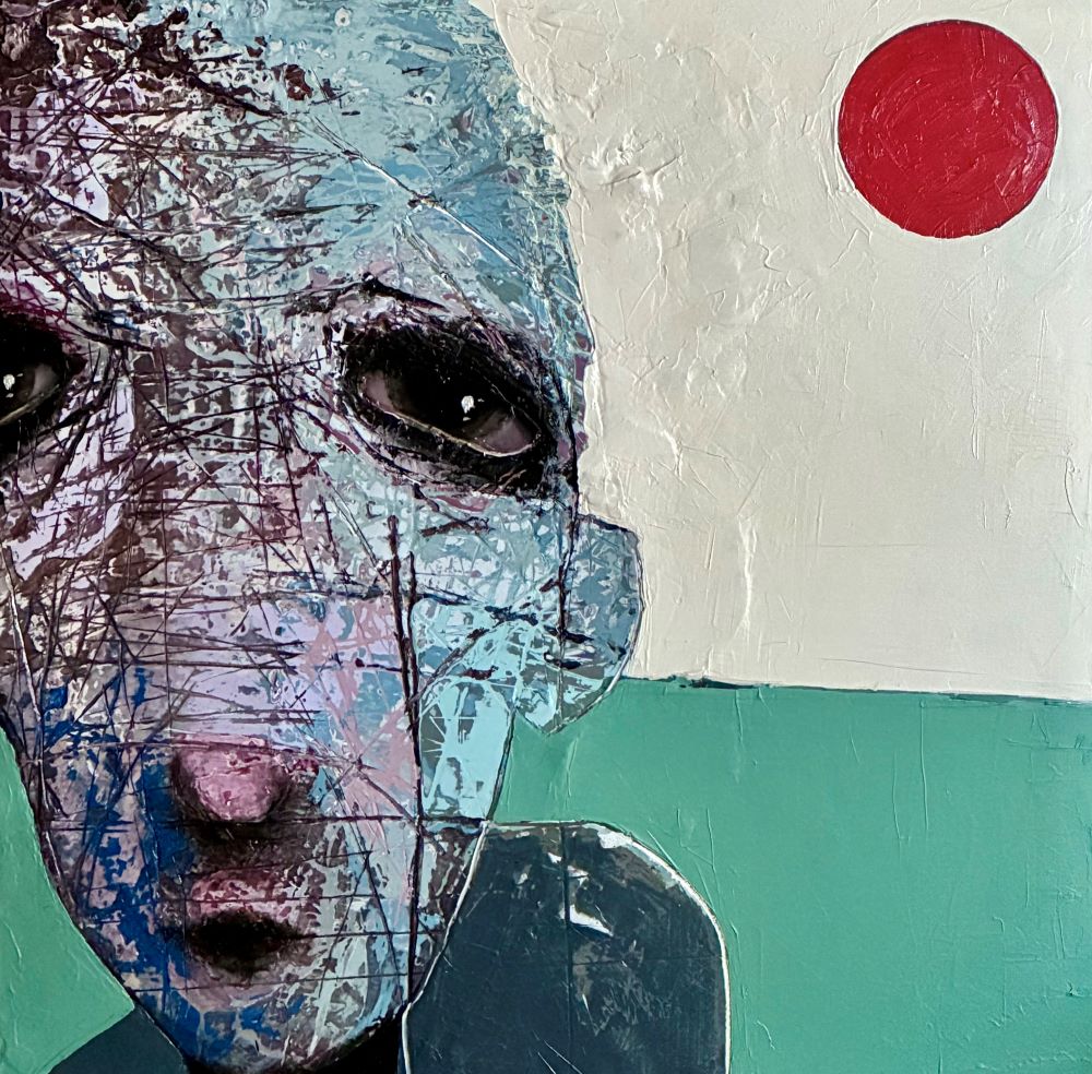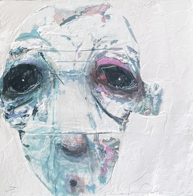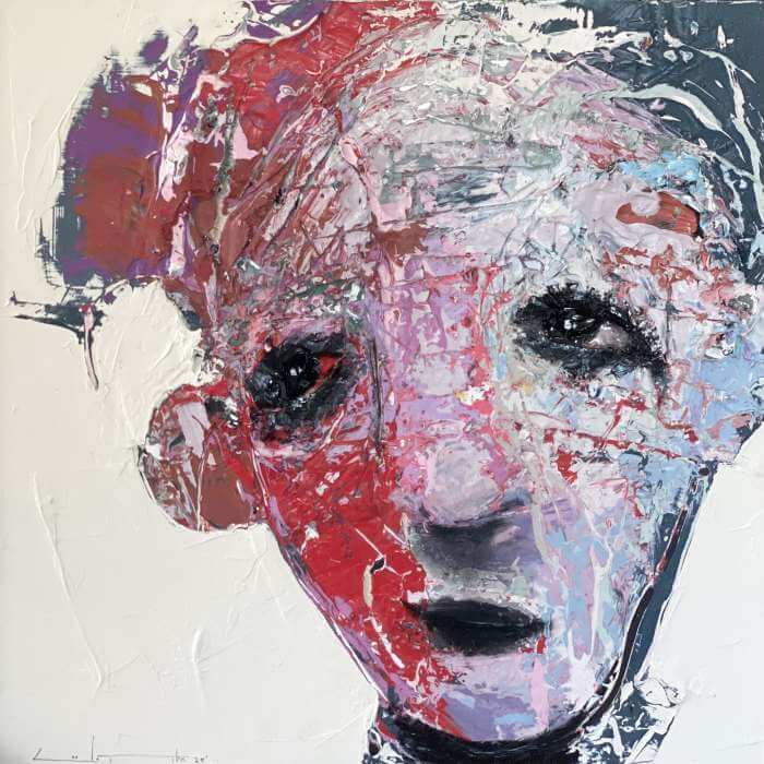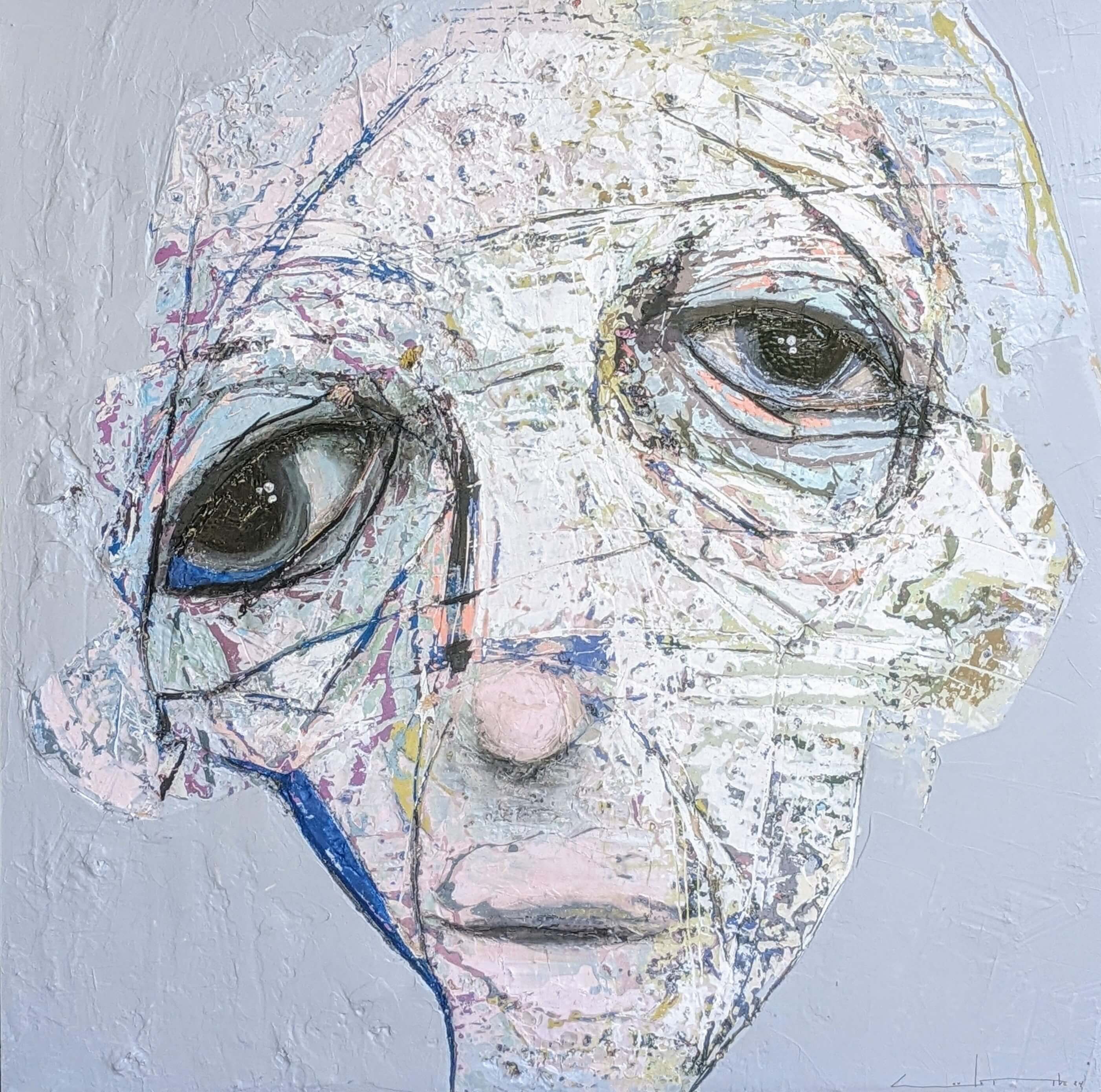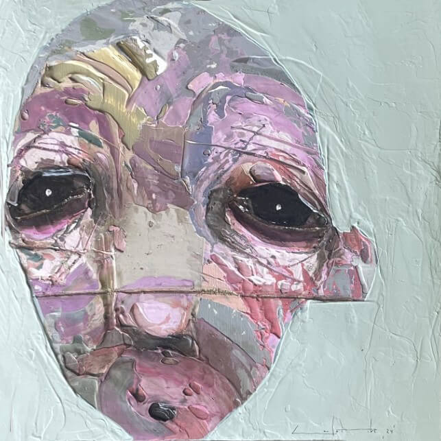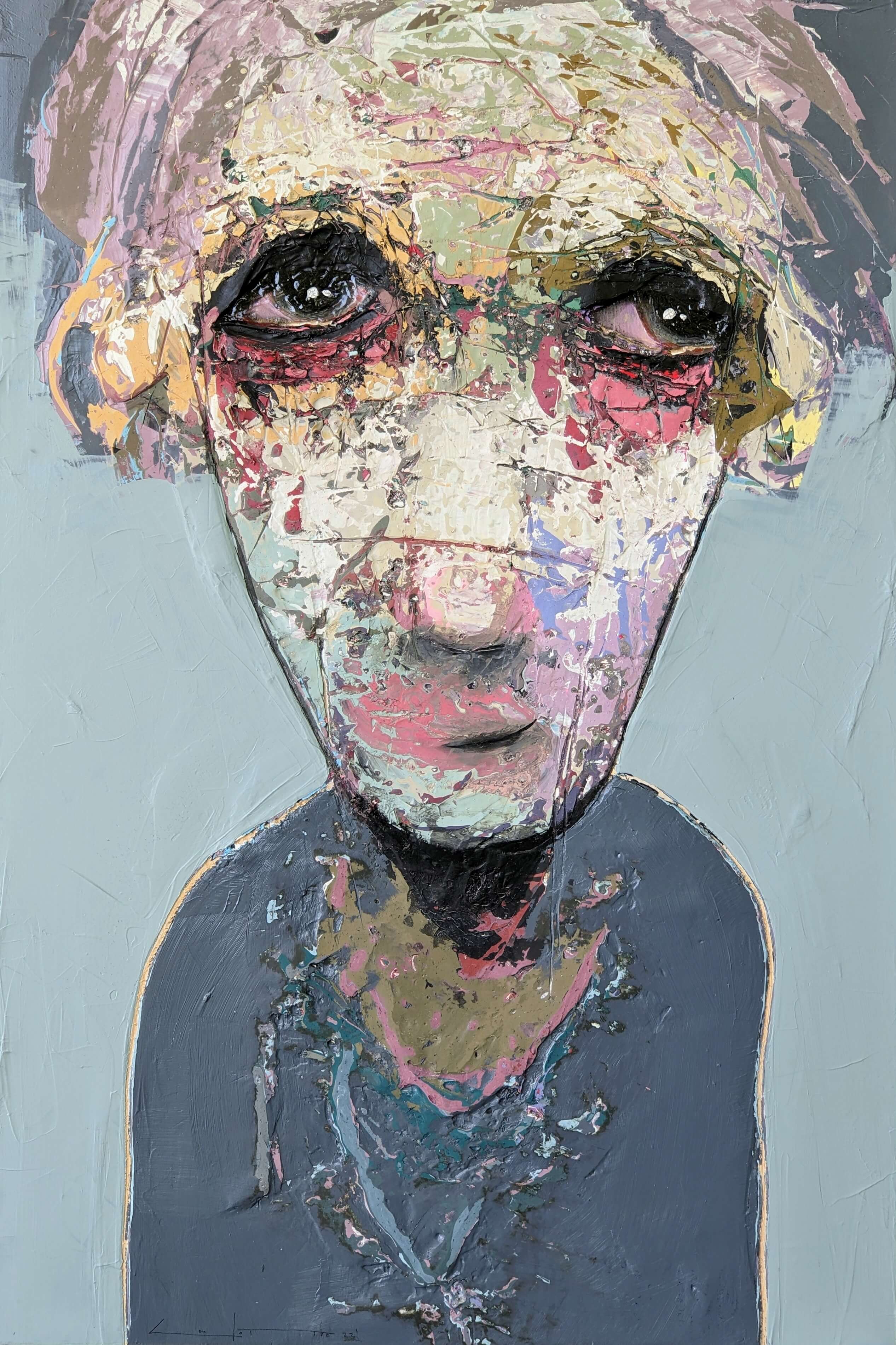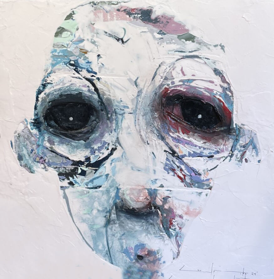 Born in Montreal in 1971, Sylvain Coulombe is an accomplished artist. Singer, composer, sculptor, architect (he graduated in Environment Design from UQÀM), he experienced art through numerous facets. Painting is now one to which he dedicates himself almost exclusively. His approach is a self-taught one and it is through his research and experimentations that he found his own plastic language. He loves paradoxes. As a matter of fact, his portraits can represent austere characters with complex expressions, geometrical compositions or round or long faces, like masks but illuminated by a rainbow of colour, often pastel. Eyes are greenish-blue, one blue, one black and gazes are divergent, one above, the other one to the right. His characters may surprise at first. From silent and cold, they rapidly convey an impression of wisdom and softness by the intensity of their gaze. ”I love what is old, what has lived. These characters carry with them signs of time’s passing, on their body, on life, and the stories that come with it. They reveal the obstacles of life, the idea of perseverance. In life, one has to work hard to appreciate something. And sometimes, it is a heavy burden to carry.” ”Each painting has a story, a meaning. The objective is not for the spectator to see it through my story but rather for him to create a personal dialogue with the artwork.”