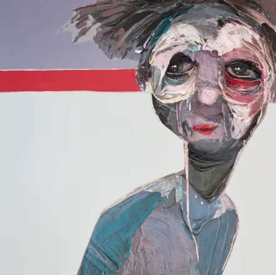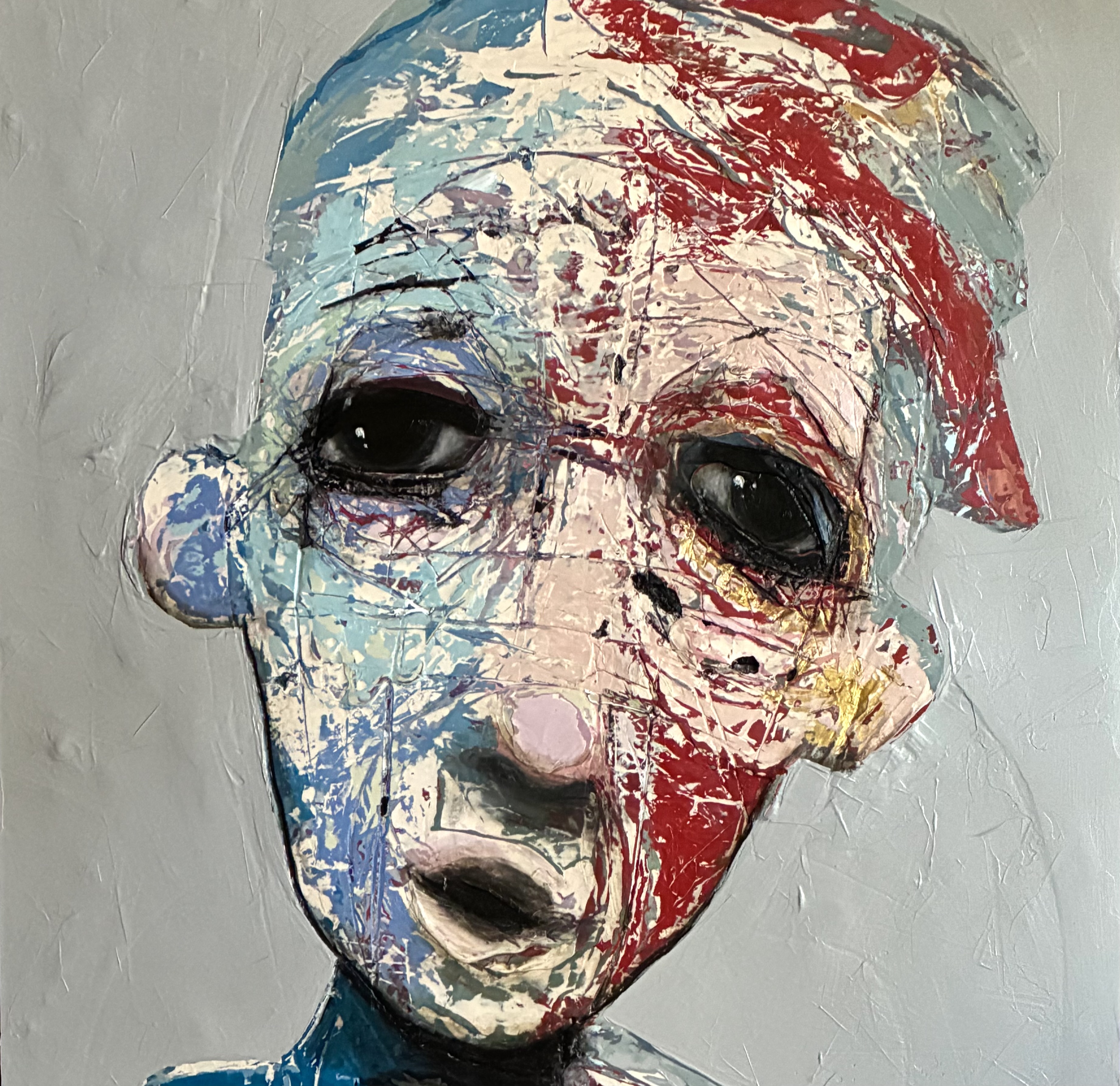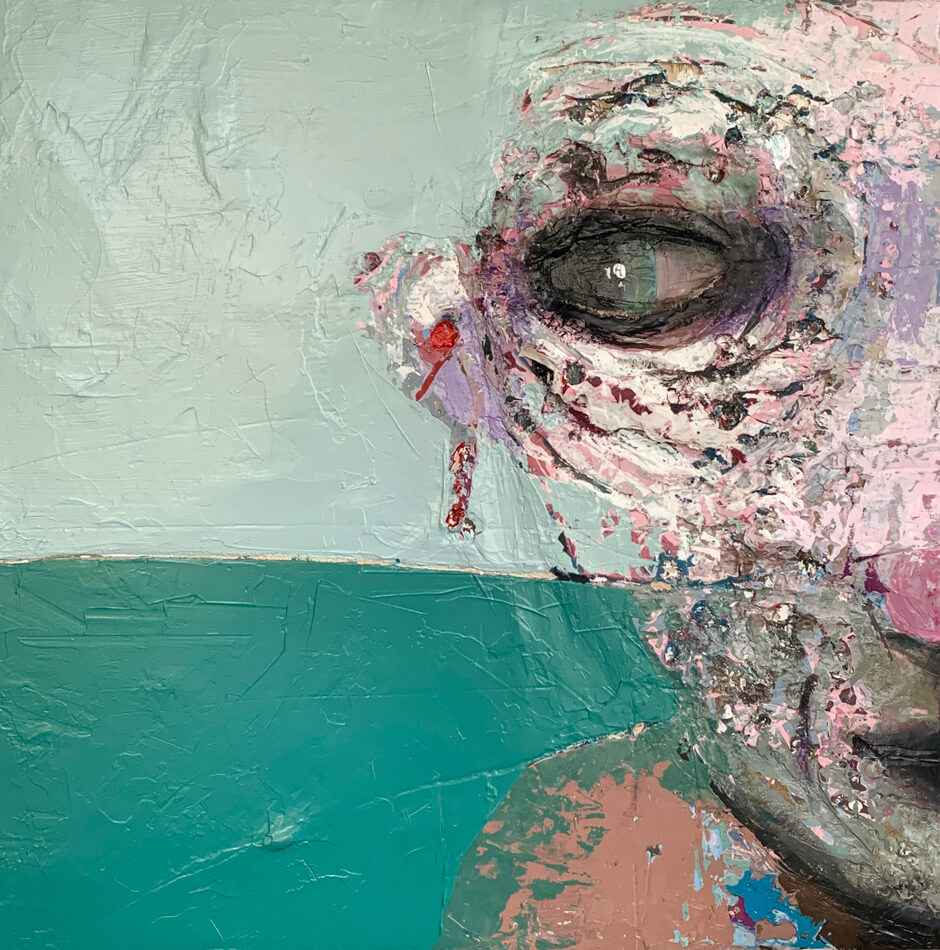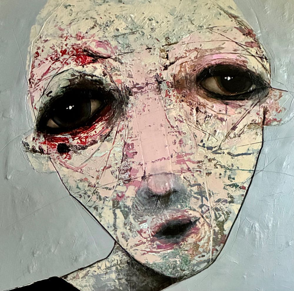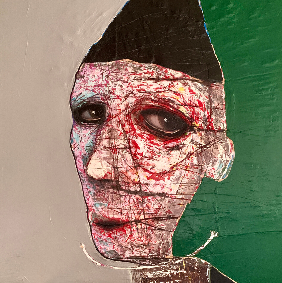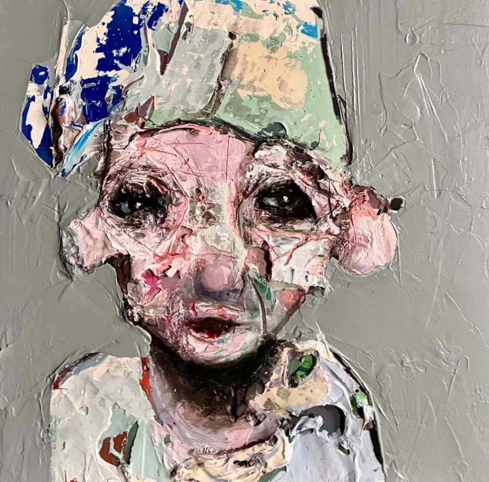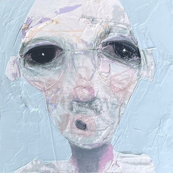 Born in Montreal in 1971, Sylvain Coulombe is an accomplished artist. Singer, composer, sculptor, architect (he graduated in Environment Design from UQÀM), he experienced art through numerous facets. Painting is now one to which he dedicates himself almost exclusively. His approach is a self-taught one and it is through his research and experimentations that he found his own plastic language. He loves paradoxes. As a matter of fact, his portraits can represent austere characters with complex expressions, geometrical compositions or round or long faces, like masks but illuminated by a rainbow of colour, often pastel. Eyes are greenish-blue, one blue, one black and gazes are divergent, one above, the other one to the right. His characters may surprise at first. From silent and cold, they rapidly convey an impression of wisdom and softness by the intensity of their gaze. ”I love what is old, what has lived. These characters carry with them signs of time’s passing, on their body, on life, and the stories that come with it. They reveal the obstacles of life, the idea of perseverance. In life, one has to work hard to appreciate something. And sometimes, it is a heavy burden to carry.” ”Each painting has a story, a meaning. The objective is not for the spectator to see it through my story but rather for him to create a personal dialogue with the artwork.”