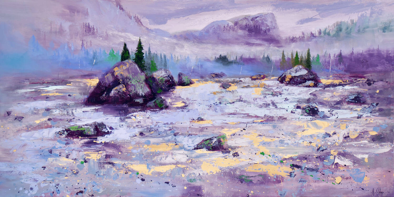Born in 1949, Réal Calder grew up in Normétal, a small mining town in northern Québec. He lives now in Mont-Saint-Hilaire in Quebec. He studied painting at the Montreal Fine arts School and later acquired his MFA at the Université of Quebec in Montreal. For over 30 years, Réal Calder has taken part in group and solo exhibitions in Quebec, Ontario, France, Israel and the Netherlands. He is the recipient of several grants from the Council for the Arts and Arts and Letters Council of Quebec. He has theached Visual Arts at the University of Quebec in the Outaouais for many years. Calder’s work is inspired by the changing natural environment and the extreme forces that can be both beautiful and terrifying. His oil paintings portray the natural activity and turbulence of the landscape in such a highly expressive style that borders on abstraction. In his physical application and manipulation of materials, Calder explores the relationship between artistic creation and the creative forces of Mother Nature, which can at times be productive and other times, destructive. Calder captures the power and wonder of nature in his work through his expressive brush strokes and layers of paints which allow his canvases to come to life.