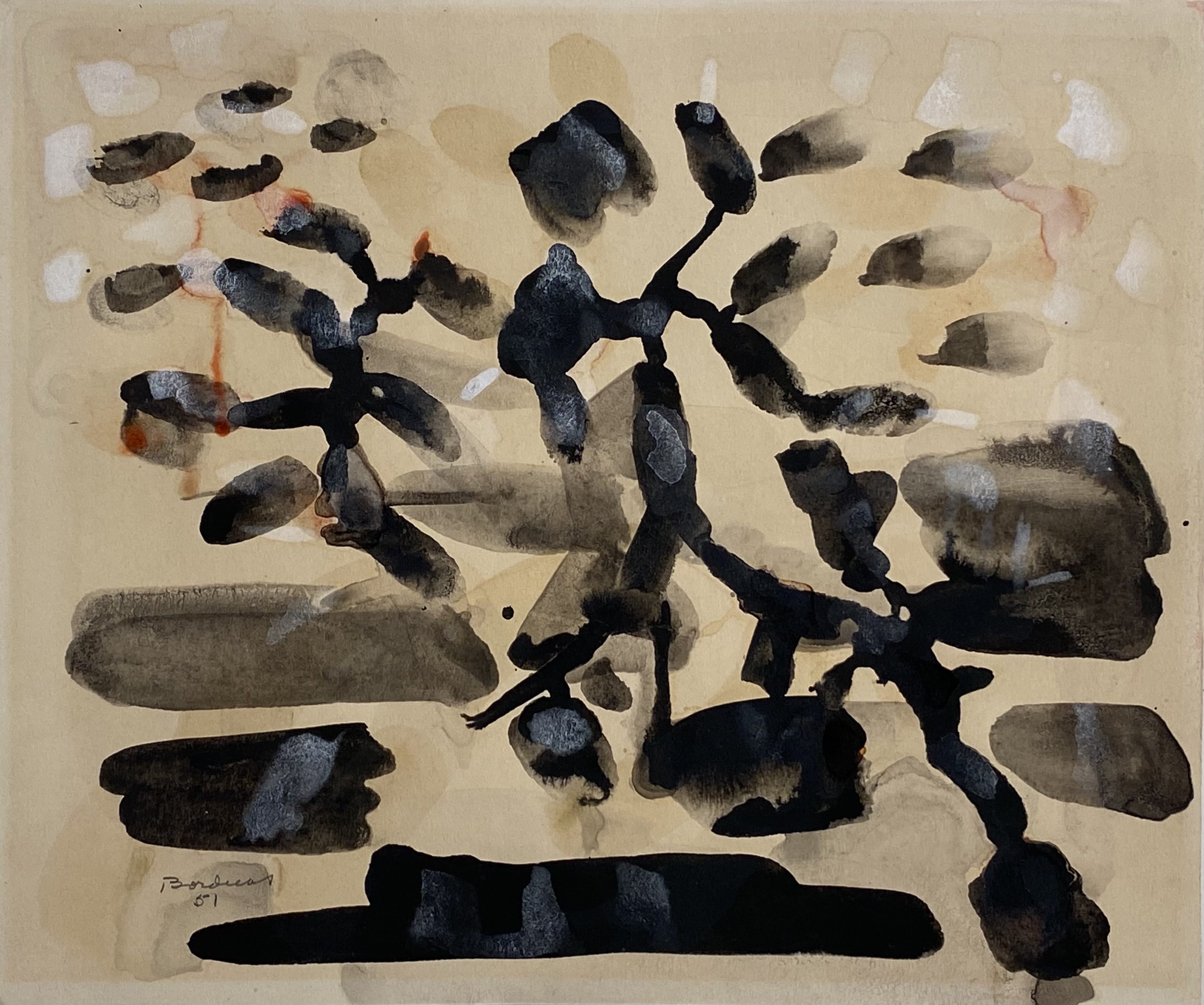 Born on November 1, 1905, in St. Hilaire (Qué.), Paul-Émile Borduas first worked as an apprentice with Ozias Leduc who taught him painting and art history. In 1923, he registered at École des beaux-arts de Montréal where he obtained a teaching diploma. In 1937, he became a teacher at École du meuble. Over the years, he founded with his students the Automatiste Movement. After presenting his first non-figurative painting attempts in 1942, Paul-Émile Borduas wrote the famous Refus global manifesto whose publication in 1948 affected all spheres of Quebec intellectual activity then. His commitment and talent made him one of the most important post-war artists.