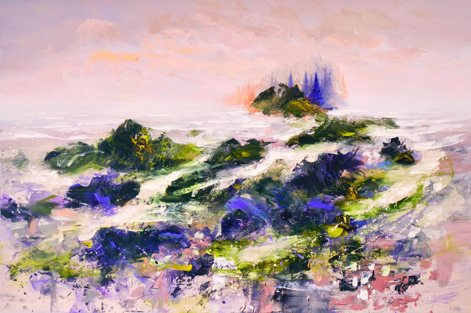 Born in 1949, Réal Calder grew up in Normétal, a small mining town in northern Québec. He lives now in Mont-Saint-Hilaire in Quebec. He studied painting at the Montreal Fine arts School and later acquired his MFA at the Université of Quebec in Montreal. For over 30 years, Réal Calder has taken part in group and solo exhibitions in Quebec, Ontario, France, Israel and the Netherlands. He is the recipient of several grants from the Council for the Arts and Arts and Letters Council of Quebec. He has theached Visual Arts at the University of Quebec in the Outaouais for many years. Calder’s work is inspired by the changing natural environment and the extreme forces that can be both beautiful and terrifying. His oil paintings portray the natural activity and turbulence of the landscape in such a highly expressive style that borders on abstraction. In his physical application and manipulation of materials, Calder explores the relationship between artistic creation and the creative forces of Mother Nature, which can at times be productive and other times, destructive. Calder captures the power and wonder of nature in his work through his expressive brush strokes and layers of paints which allow his canvases to come to life.