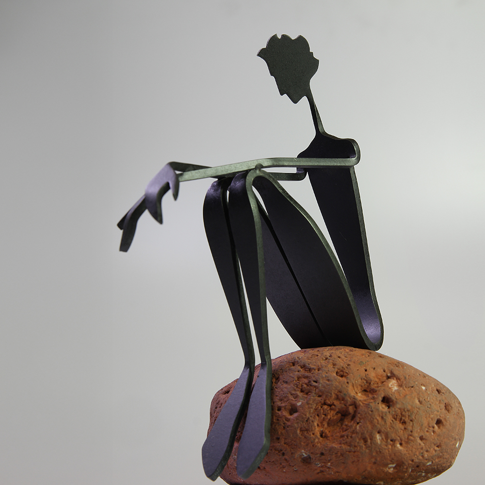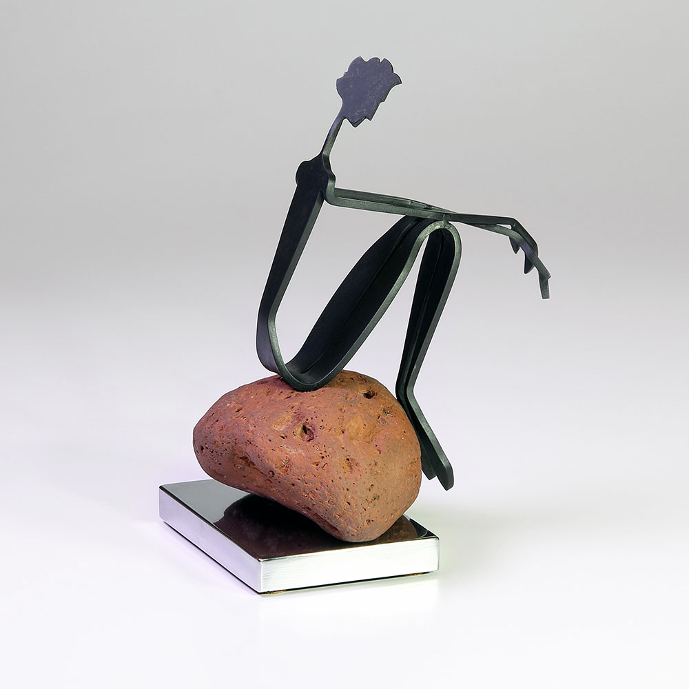 Travaillant principalement le métal, parfois associé à la pierre ou au bois, Duchesne privilégie des lignes fines et des silhouettes élancées qui suggèrent le mouvement, la fragilité et l’équilibre. Chaque pièce devient un fragment de récit où posture, tension et silence invitent le regardeur à compléter l’histoire.