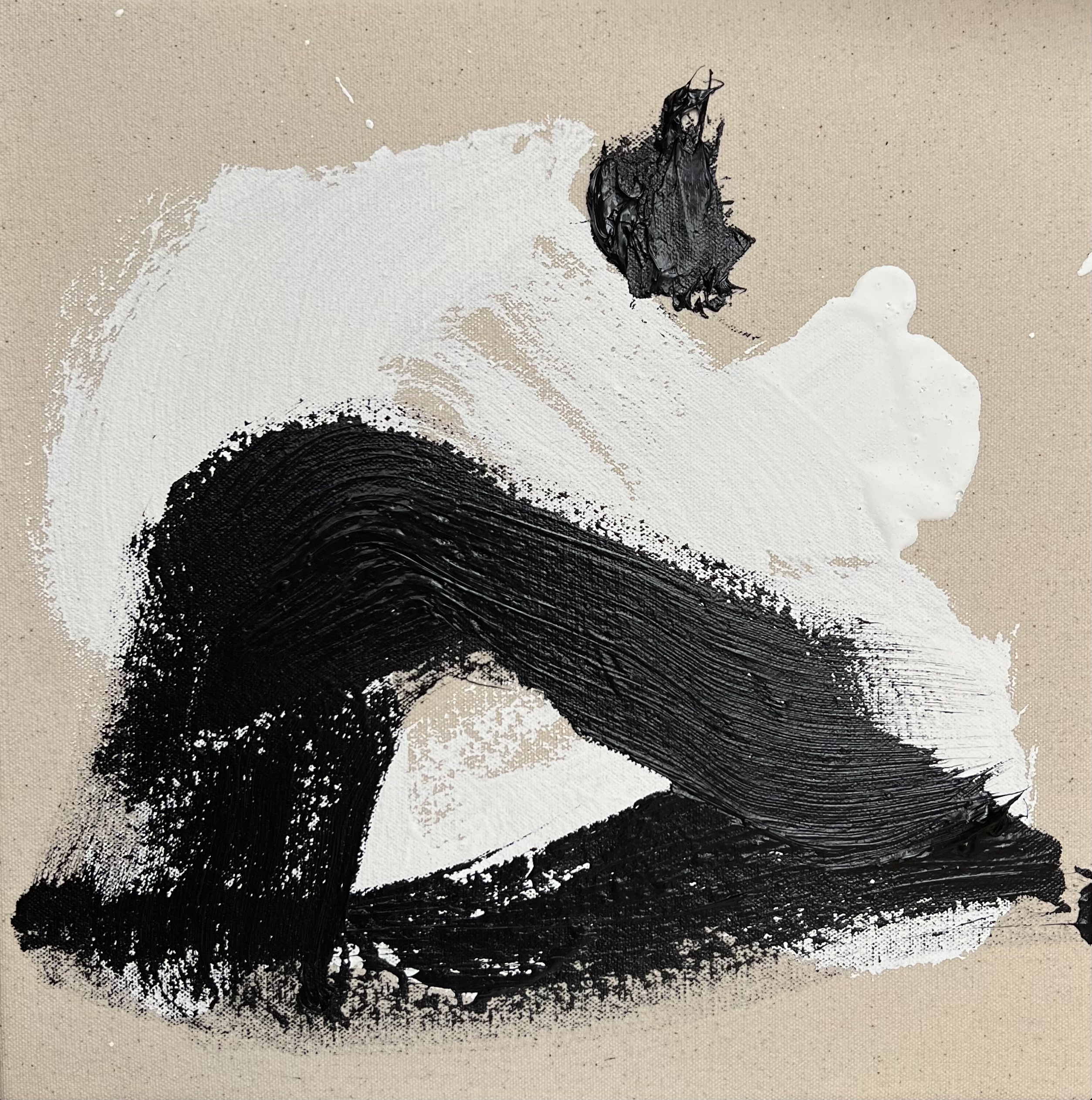 L’investissement du corps est total lorsqu’elle peint, de l’ordre de la performance ; sa gestuelle est viscérale, ancrée, entière et fougueuse, voire presque brutale. Elle visualise de manière méditative et s’élance intuitivement dans un même souffle, non pas par automatisme, mais portée par son mouvement intérieur. Le résultat est épuré et esthétique, balancé, sans couvrir totalement la toile de coton brute, en apesanteur.