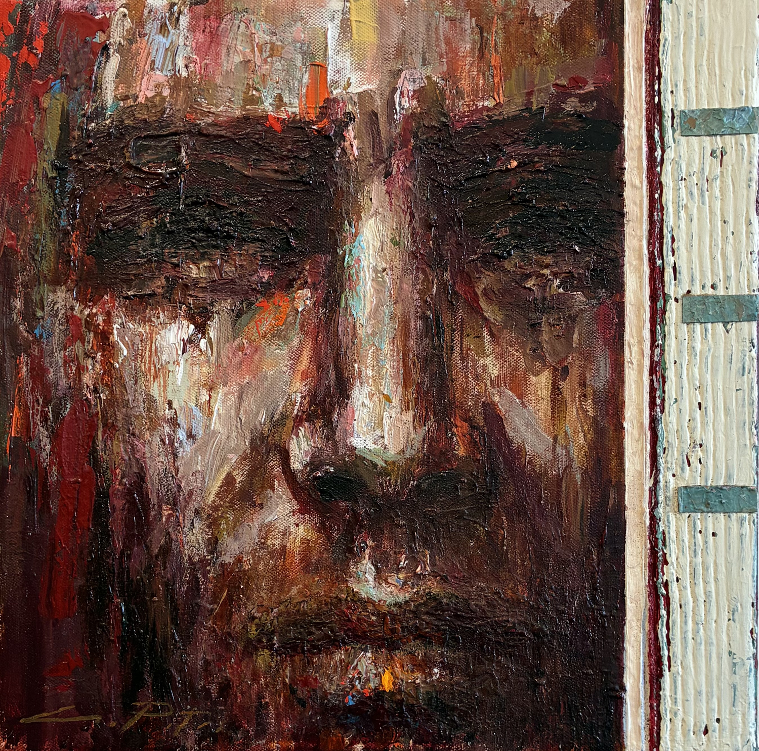 et réduits à l’essentiel, s’intègrent à une composition où le visage devient un élément du tableau au