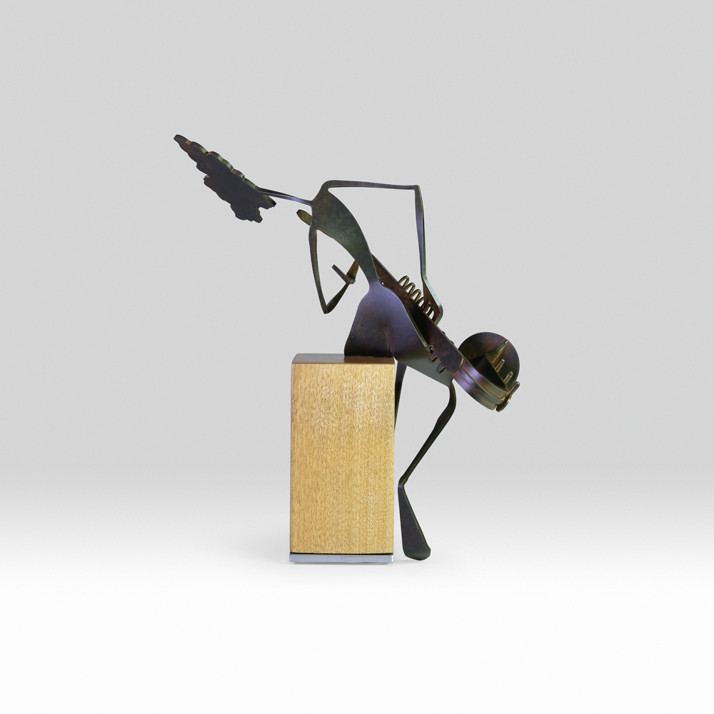 Travaillant principalement le métal, parfois associé à la pierre ou au bois, Duchesne privilégie des lignes fines et des silhouettes élancées qui suggèrent le mouvement, la fragilité et l’équilibre. Chaque pièce devient un fragment de récit où posture, tension et silence invitent le regardeur à compléter l’histoire.