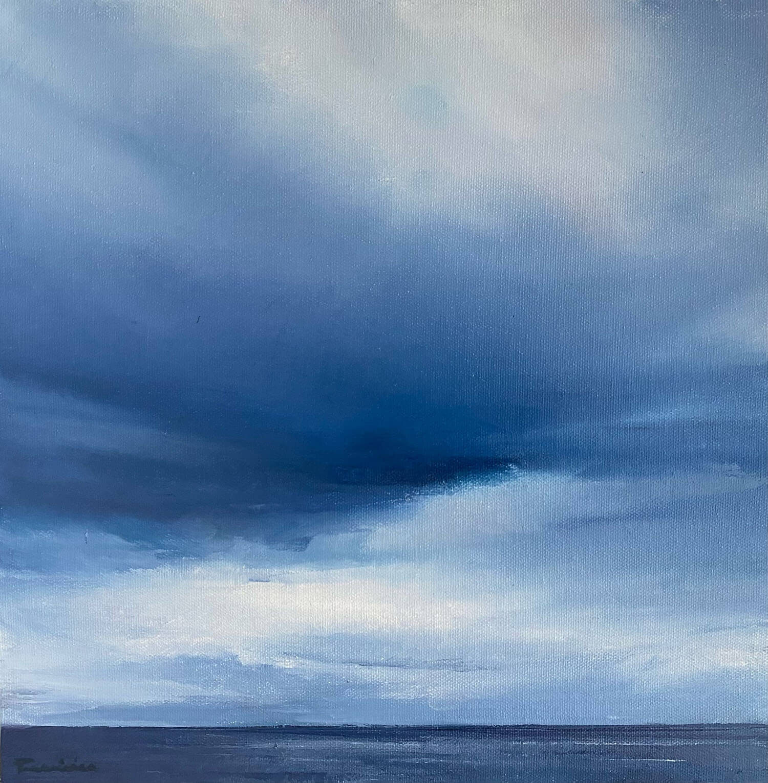 “ Les paysages sont ma principale source d’inspiration. Le ciel qu’offre la nature m’a toujours fasciné et me guide dans mon travail de création. Je ne peins pas de lieu précis, je découvre petit à petit ce que mon inspiration me dicte. Je peins à l’huile à la spatule, ma technique crée des effets vaporeux et des fondus recherchés où je laisse côtoyer l’abstraction et la figuration.“