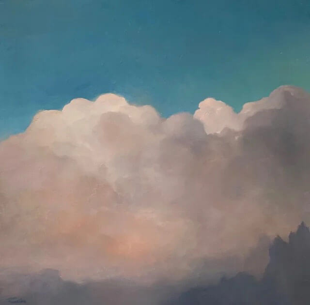 “ Les paysages sont ma principale source d’inspiration. Le ciel qu’offre la nature m’a toujours fasciné et me guide dans mon travail de création. Je ne peins pas de lieu précis, je découvre petit à petit ce que mon inspiration me dicte. Je peins à l’huile à la spatule, ma technique crée des effets vaporeux et des fondus recherchés où je laisse côtoyer l’abstraction et la figuration.“