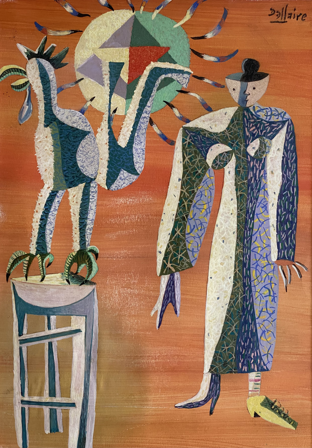 Jean-Philippe Dallaire, né à Hull en 1916, décédé en 1965 à l’âge de 49 ans. Jean-Philippe Dallaire étudie l’art à l’École technique de Hull et à la Central Technical School de Toronto de 1932 et 1935. En 1938-1939, il poursuit ses études, d’abord à l’École des Beaux-Arts de Montréal, puis aux Ateliers d’Art Sacré et à l’Académie André Lhote à Paris. Après l’occupation allemande de Paris, Jean Dallaire et son épouse sont envoyés dans un camp d’internement. Sa femme est relâchée six mois après mais son internement à lui se prolonge et cette expérience aurait eu une profonde influence sur son oeuvre. Après la guerre, il rentre au Canada et enseigne à l’École des Beaux-Arts à Québec de 1945 à 1952. Il est embauché par l’Office national du film comme dessinateur pour des films fixes, d’abord à Ottawa (de 1952 à 1956), puis à Montréal (de 1956 à 1958). Il conserve aussi son atelier d’artiste, crée de grandes toiles qui reflètent des échos du cubisme analytique, et reçoit des commandes de dessin de tapisseries. Jean Dallaire monte plusieurs expositions individuelles en France et au Canada et se voit décerner en 1938 un prix de peinture de la province du Québec. Il habite à Vence, dans le midi de la France, jusqu’à sa mort.